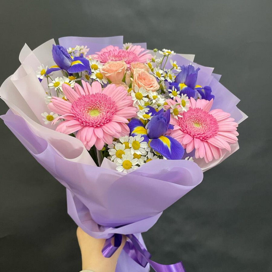На фото букет «лиловый конфетти». В составе: ирис 3 шт, кустовая роза 1 шт, танацетум 3 шт, гербера 3 шт, дизайнерская упаковка 1 шт, атласная лента 1 шт, . Все цветы свежие и ароматные, букет красиво оформлен и отлично подходит для подарка. Доступна доставка цветов или самовывоз.
